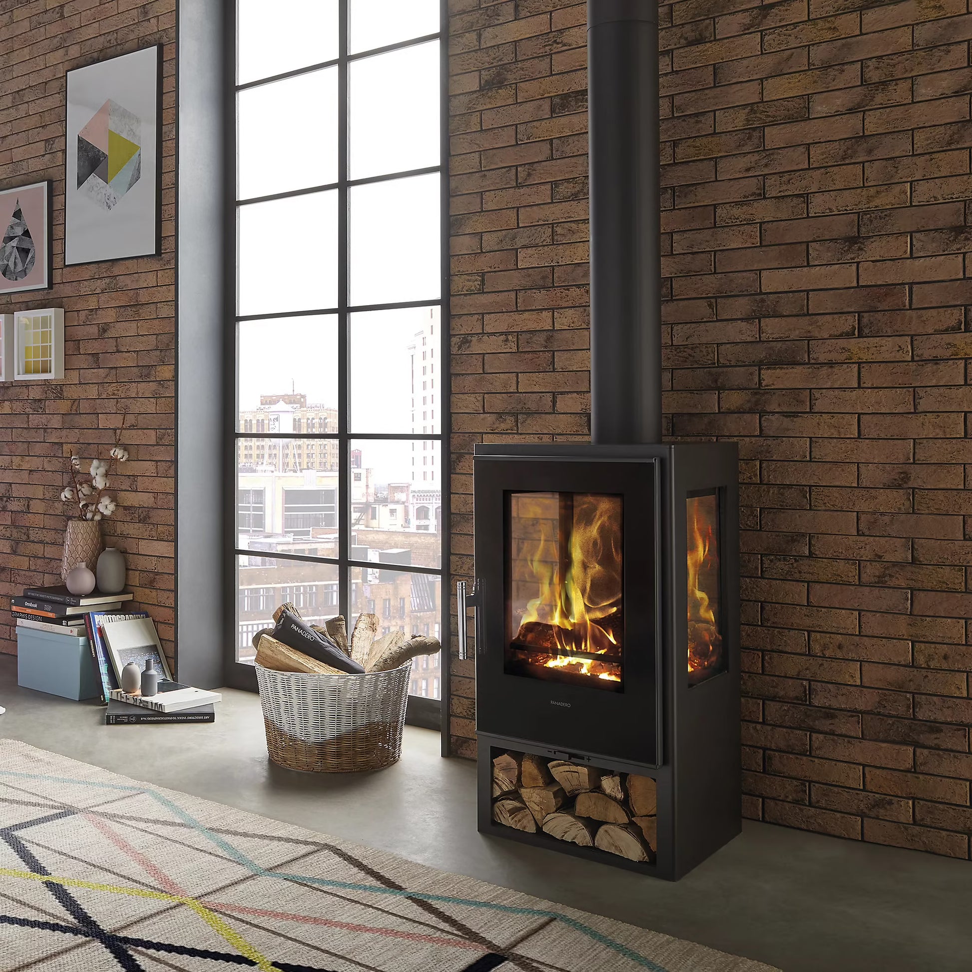 Il nous offre la possibilité de stocker des bûches jusqu’à 40 cm dans son bûcher, ce qui ajoute de la fonctionnalité avec une touche de chaleur et de confort. Porte en verre sérigraphié et triple vue sur le feu. Il dispose d’une prise d’air extérieure, et son intérieur est tapissé de vermiculite, ce qui permet une plus grande puissance.